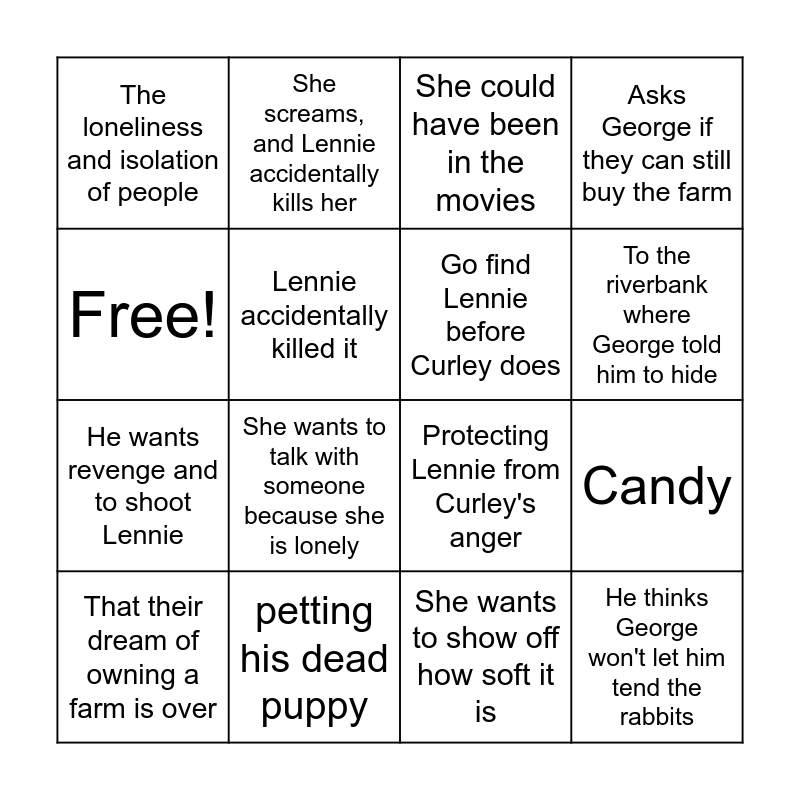 This bingo card has 16 words: petting his dead puppy, Candy, She could have been in the movies, The loneliness and isolation of people, He wants revenge and to shoot Lennie, She screams, and Lennie accidentally kills her, Protecting Lennie from Curley's anger, She wants to show off how soft it is, Free!, Lennie accidentally killed it, That their dream of owning a farm is over, Asks George if they can still buy the farm, She wants to talk with someone because she is lonely, To the riverbank where George told him to hide, Go find Lennie before Curley does and He thinks George won't let him tend the rabbits.