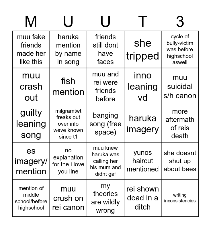 This bingo card has a free space and 24 words: no explanation for the i love you line, muu crush on rei canon, muu and rei were friends before, mention of middle school/before highschool, cycle of bully-victim was before highschool aswell, muu fake friends made her like this, muu crash out, haruka mention by name in song, haruka imagery, muu knew haruka was calling her his mum and didnt gaf, inno leaning vd, guilty leaning song, yunos haircut mentioned, she doesnt shut up about bees, fish mention, rei shown dead in a ditch, more aftermath of reis death, friends still dont have faces, muu suicidal s/h canon, milgramtwt freaks out over info weve known since t1, writing inconsistencies, es imagery/ mention, she tripped and my theories are wildly wrong.