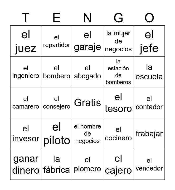 This bingo card has a free space and 35 words: el director de la esucela, el enfermero, el médico, el bombero, el hombre de negocios, la mujer de negocios, el ingeniero, el obrero, el abogado, el cartero, el camarero, el jefe, el gerente, el dependiente, el juez, el tesoro, el cajero, el consejero, el invesor, el vendedor, el cocinero, ganar dinero, trabajar, la fábrica, el garaje, la escuela, la ama de casa, la estación de policia, la estación de bomberos, el contador, el cirujano, el plomero, el piloto, el repartidor and el periodista.