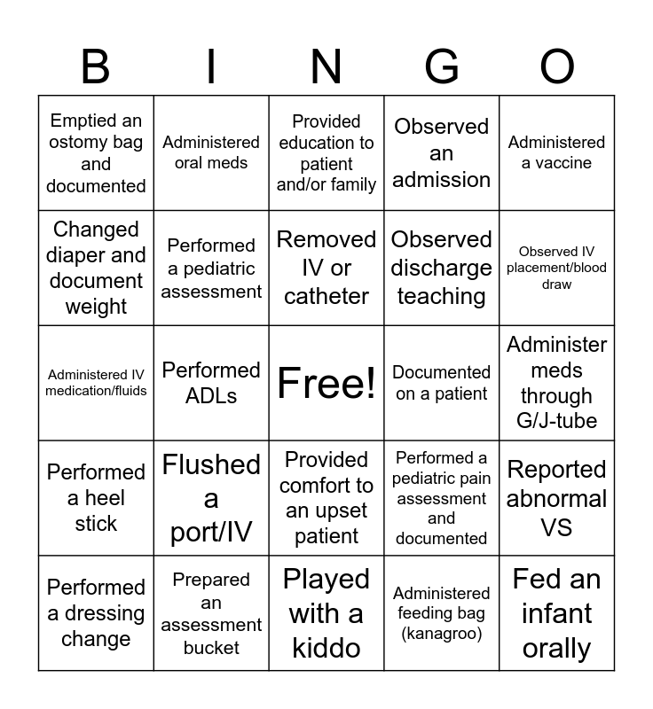 This bingo card has a free space and 24 words: Flushed a port/IV, Prepared an assessment bucket, Removed IV or catheter, Performed a dressing change, Administered a vaccine, Emptied an ostomy bag and documented, Changed diaper and document weight, Administered oral meds, Documented on a patient, Provided comfort to an upset patient, Observed discharge teaching, Administered IV medication/fluids, Performed a pediatric pain assessment and documented, Reported abnormal VS, Performed a pediatric assessment, Administered feeding bag (kanagroo), Administer meds through G/J-tube, Provided education to patient and/or family, Observed IV placement/blood draw, Performed ADLs, Fed an infant orally, Performed a heel stick, Observed an admission and Played with a kiddo.