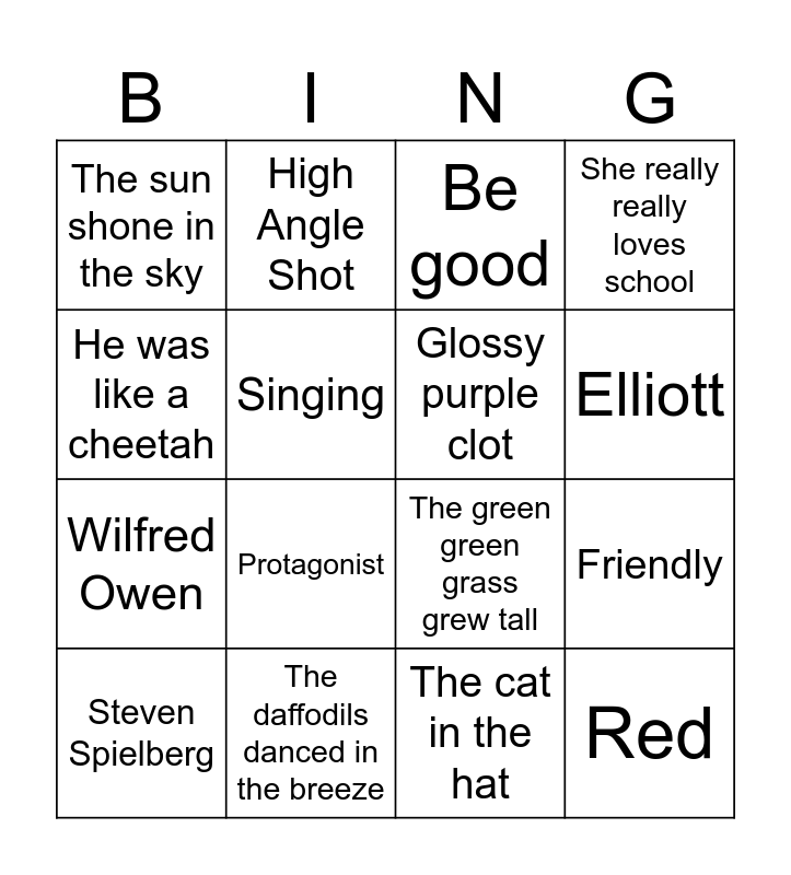 This bingo card has 16 words: The daffodils danced in the breeze, Friendly, Be good, The sun shone in the sky, Wilfred Owen, High Angle Shot, The green green grass grew tall, The cat in the hat, He was like a cheetah, Singing, Steven Spielberg, She really really loves school, Protagonist, Elliott, Glossy purple clot and Red.