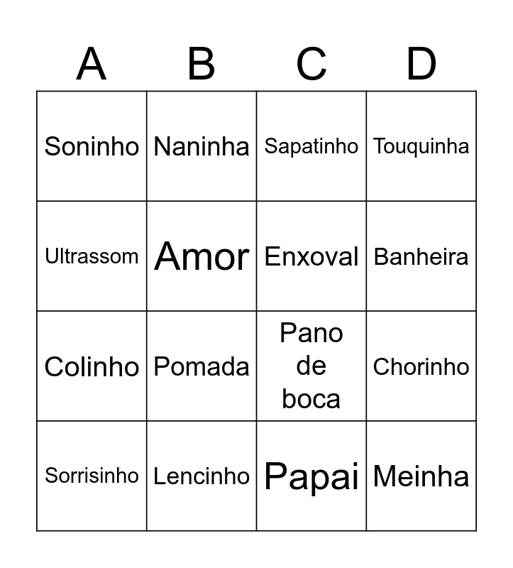 This bingo card has 65 words: Free!, Fralda, Chupeta, Mamadeira, Carrinho, Berço, Naninha, Body, Banheira, Lenço, Talco, Mamãe, Papai, Ultrassom, Chá de bebê, Amor, Chorinho, Soninho, Mamá, Colinho, Cobertor, Meinha, Touquinha, Babador, Cueiro, Maternidade, Paternidade, Dentinhos, Sorrisinho, Charutinho, Mimo, Carinho, Cegonha, Bebê conforto, Ursinho, Travesseirinho, Roupinha, Pano de boca, Amamentação, Bico, Enxoval, Fraldinha, Lencinho, Mordedor, Sabonete, Shampoo, Pomada, Banho, Cheirinho, Dedinho, Chute, Barriguinha, Ecografia, Nascimento, Amor de mãe, Amor de pai, Beijinho, Sapatinho, Macacão, Gravidez, Teste positivo, Mamãe coruja, Papai babão, Cobertorzinho and Abraço.