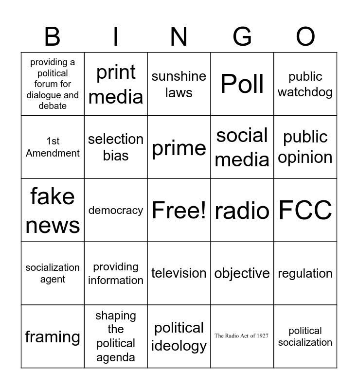 This bingo card has 1 images, a free space and 23 words: providing information, shaping the political agenda, prime, framing, public watchdog, providing a political forum for dialogue and debate, 1st Amendment, print media, radio, television, social media, fake news, objective, regulation, selection bias, FCC, sunshine laws, public opinion, democracy, political socialization, socialization agent, Poll and political ideology.