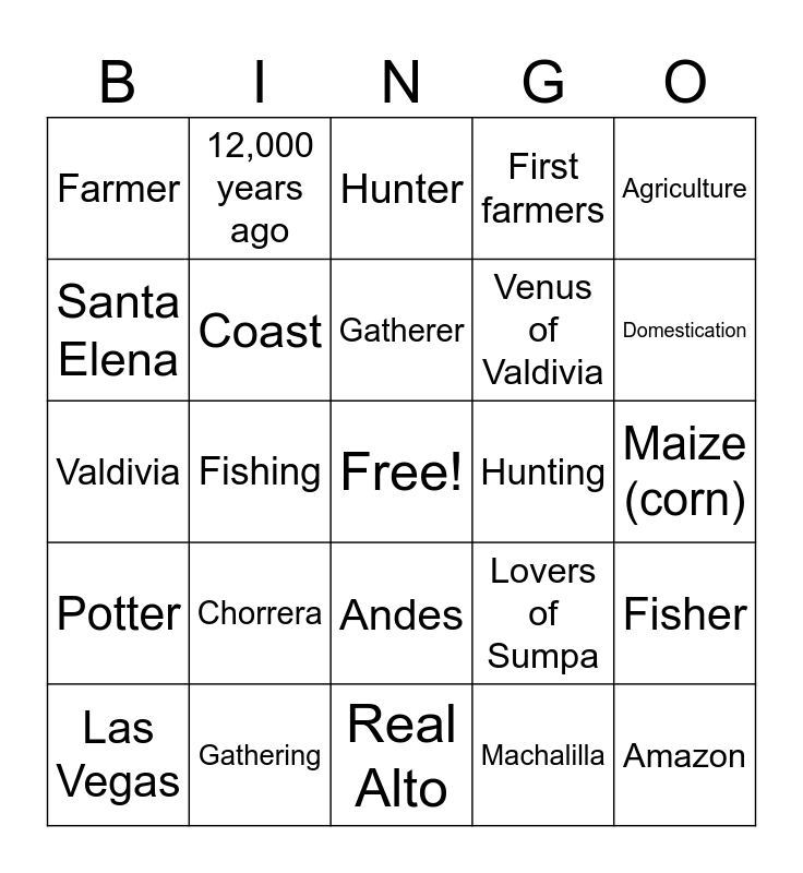 This bingo card has a free space and 24 words: Chorrera, Gathering, Gatherer, Las Vegas, Agriculture, Farmer, Santa Elena, 12,000 years ago, Hunting, Andes, Venus of Valdivia, Valdivia, Lovers of Sumpa, Fisher, Coast, Machalilla, Maize (corn), Hunter, Domestication, Fishing, Amazon, Potter, First farmers and Real Alto.