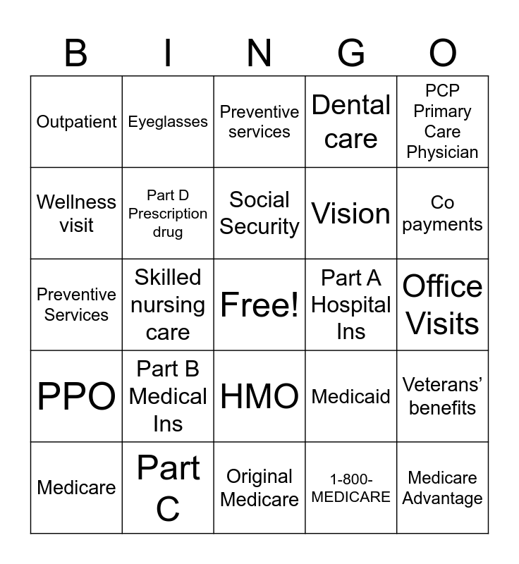 This bingo card has a free space and 29 words: Medicare, Inpatient care, Skilled nursing care, Home health care, Outpatient, Preventive services, Part D Prescription drug, Part B Medical Ins, Part A Hospital Ins, Part C, Office Visits, Medicare Advantage, Original Medicare, 1-800-MEDICARE, Co payments, Hearing aids, HMO, PPO, PCP Primary Care Physician, Preventive Services, Medicaid, Open Enrollment, Vision, Wellness visit, Dental care, Eyeglasses, Veterans’ benefits, Social Security and $100 of OTC.