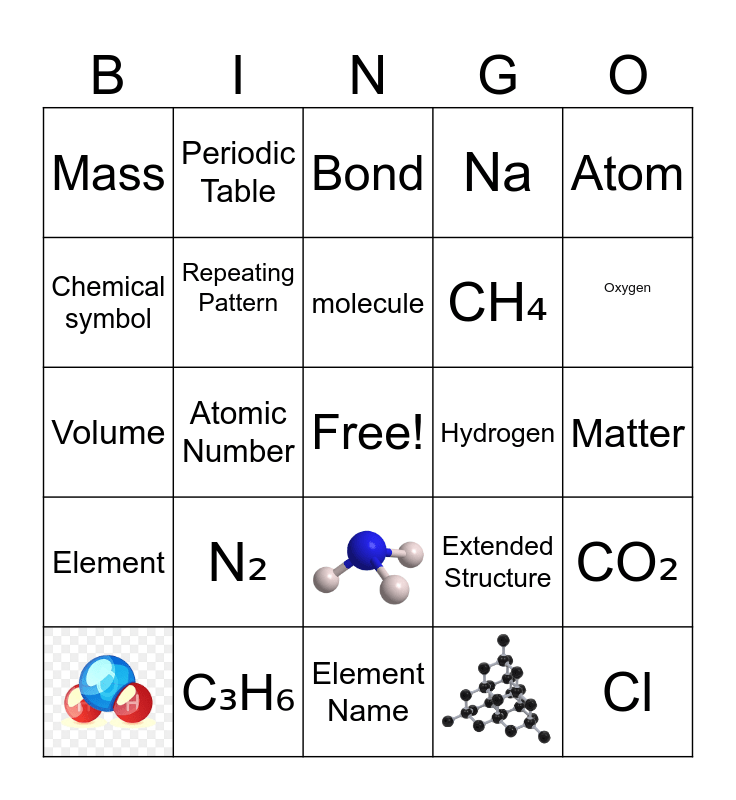 This bingo card has 3 images, a free space and 21 words: N₂, C₃H₆, molecule, Atom, Mass, Chemical symbol, Periodic Table, Hydrogen, CH₄, Volume, Extended Structure, CO₂, Repeating Pattern, Matter, Bond, Oxygen, Atomic Number, Cl, Element, Na and Element Name.