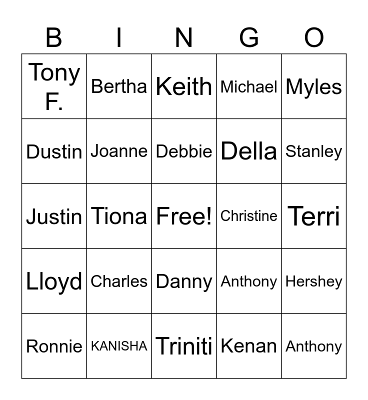 This bingo card has a free space and 59 words: KK, KANISHA, Katie, Lloyd, Kenan, Tanisha, Joanne, Raymond, Della, Dezeray, Michael, Davon, Dustin, Shay, Mike B, Tony F., Anthony, Myles, Kammie, Debbie, Christine, Keith, Ronnie, Hershey, Karissa, Stefanie, Nadia, Ray, Stanley, Stevie, Tomas, Herbie, Ryan, Derrius, Bertha, Jessie, Tommy, Tiona, Robert, Justin, Kendall, Charles, Terri, Brenton, Karen, Vicki, Narchelle, Orlando, Danny, Triniti, NATHAN, Phong, Nolan, Gage, Tamara, Anthony, Trevor, Greg and Veronica.