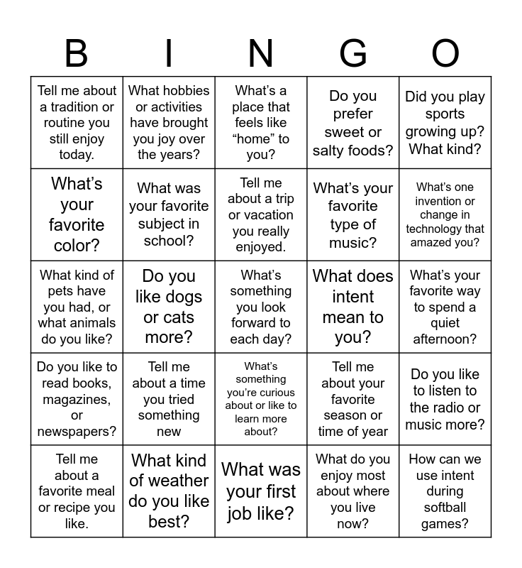 This bingo card has 25 words: Tell me about a time you tried something new, What was your first job like?, Tell me about a trip or vacation you really enjoyed., Tell me about a favorite meal or recipe you like., Did you play sports growing up? What kind?, Tell me about a tradition or routine you still enjoy today., What’s your favorite color?, What hobbies or activities have brought you joy over the years?, What does intent mean to you?, What’s something you’re curious about or like to learn more about?, What’s your favorite type of music?, What kind of pets have you had, or what animals do you like?, Tell me about your favorite season or time of year, Do you like to listen to the radio or music more?, What was your favorite subject in school?, How can we use intent during softball games?, What’s your favorite way to spend a quiet afternoon?, What’s a place that feels like “home” to you?, What’s one invention or change in technology that amazed you?, Do you like dogs or cats more?, What’s something you look forward to each day?, What kind of weather do you like best?, Do you like to read books, magazines, or newspapers?, Do you prefer sweet or salty foods? and What do you enjoy most about where you live now?.