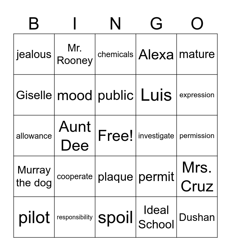 This bingo card has a free space and 33 words: experiment, Charly, Aunt Dee, Dad, Murray the dog, mood, mature, pilot, Mr. Rooney, garden, public, chemicals, drought, digit, investigate, expression, responsibility, allowance, cooperate, permit, plaque, revolution, jealous, permission, spoil, Dushan, Alexa, Luis, Giselle, Mrs. Cruz, Roman, Ideal School and Dad's study.