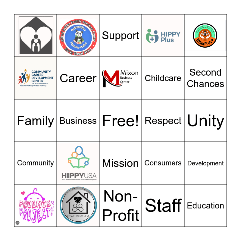 This bingo card has 9 images, a free space and 15 words: Respect, Mission, Childcare, Family, Consumers, Development, Career, Staff, Unity, Support, Second Chances, Business, Education, Community and Non-Profit.