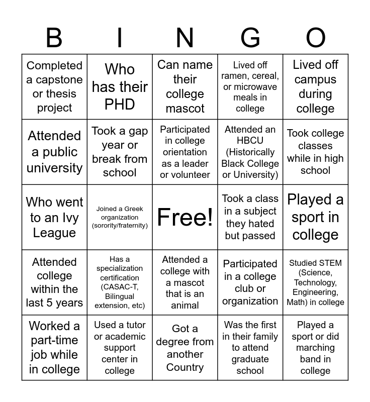 This bingo card has a free space and 58 words: Was a first-generation college student, Changed majors in college, Studied something different than what they teach now, Participated in a college club or organization, Played a sport or did marching band in college, Studied abroad, Took a gap year or break from school, Attended a PWI (Predominantly White Institution), Attended an HBCU (Historically Black College or University), Attended a community college, Attended a public university, Transferred colleges during undergrad, Attended college in another state, Attended an online or hybrid program, Who got their masters, Who has their PHD, Got a degree from another Country, Lived off ramen, cereal, or microwave meals in college, Used public transportation every day in college, Who went to an Ivy League, Joined a Greek organization (sorority/fraternity), Can name their college mascot, Still talks to someone they met in college, Played a sport in college, Who has more than one graduate degrees, Has a specialization certification (CASAC-T, Bilingual extension, etc), Who has a degree in Social Work, Lived on campus during college, Lived off campus during college, Worked a part-time job while in college, Was a resident advisor (RA) in college, Took night classes in college, Took summer classes in college, Attended college more than 20 years ago, Attended college within the last 5 years, Did an internship during college, Was involved in student government in college, Took a class in a subject they hated but passed, Took college classes while in high school, Took AP classes in high school, Used a tutor or academic support center in college, Attended a college with a mascot that is an animal, Has published an academic paper or article, Presented at a conference during or after college, Participated in college theater or arts, Learned a foreign language in college, Joined a cultural or identity-based club in college, Was the first in their family to attend graduate school, Studied STEM (Science, Technology, Engineering, Math) in college, Studied Humanities or Social Sciences in college, Was on academic probation at some point, Received a scholarship for college, Attended a trade or vocational school before or after college, Changed career paths after college, Completed a capstone or thesis project, Was a member of an honor society, Participated in college orientation as a leader or volunteer and Used college counseling or mental health services.