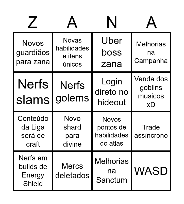 This bingo card has 16 words: Mercs deletados, Trade assíncrono, Uber boss zana, Novos guardiãos para zana, Conteúdo da Liga será de craft, Novas habilidades e itens únicos, Novos pontos de habilidades do atlas, Melhorias na Sanctum, Nerfs slams, Nerfs golems, Nerfs em builds de Energy Shield, Melhorias na Campanha, Novo shard para divine, Venda dos goblins musicos xD, Login direto no hideout and WASD.