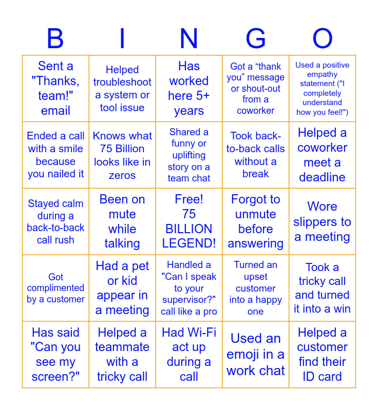 This bingo card has a free space and 29 words: Has said "Can you see my screen?", Celebrated a work win with coffee, Been on mute while talking, Joined a meeting from their phone, Sent a "Thanks, team!" email, Has worked here 5+ years, Knows what 75 Billion looks like in zeros, Had a pet or kid appear in a meeting, Forgot to unmute before answering, Helped a teammate with a tricky call, Wore slippers to a meeting, Helped a customer find their ID card, Had Wi-Fi act up during a call, Used an emoji in a work chat, Helped a coworker meet a deadline, Gave a shout-out to a teammate, Handled a "Can I speak to your supervisor?" call like a pro, Got complimented by a customer, Used a positive empathy statement ("I completely understand how you feel!"), Stayed calm during a back-to-back call rush, Turned an upset customer into a happy one, Said "Let me pull up your policy details", Took back-to-back calls without a break, Ended a call with a smile because you nailed it, Got a “thank you” message or shout-out from a coworker, Helped troubleshoot a system or tool issue, Took a tricky call and turned it into a win, Shared a funny or uplifting story on a team chat and Celebrated a teammate’s success or milestone 🎉.