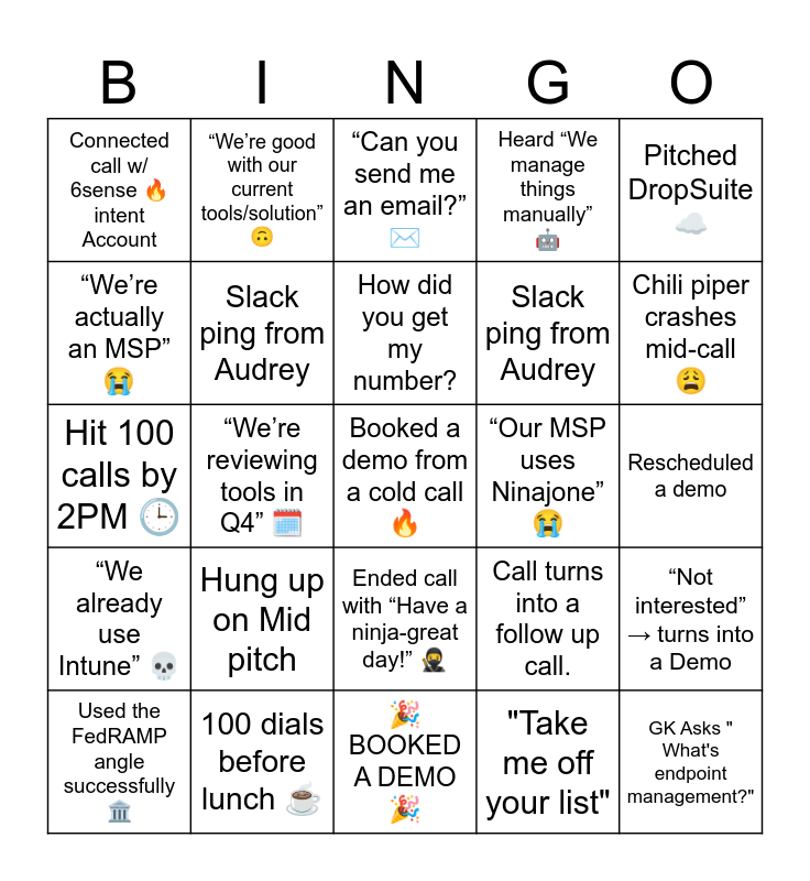 This bingo card has 25 words: “We already use Intune” 💀, 100 dials before lunch ☕, Booked a demo from a cold call 🔥, "Take me off your list", Pitched DropSuite ☁️, Connected call w/ 6sense 🔥 intent Account, “We’re good with our current tools/solution” 🙃, “Can you send me an email?” ✉️, “Our MSP uses Ninajone” 😭, “Not interested” → turns into a Demo, “We’re actually an MSP” 😭, Slack ping from Audrey, 🎉 BOOKED A DEMO 🎉, Call turns into a follow up call., Chili piper crashes mid-call 😩, Used the FedRAMP angle successfully 🏛️, “We’re reviewing tools in Q4” 🗓️, How did you get my number?, Slack ping from Audrey, Rescheduled a demo, Hit 100 calls by 2PM 🕒, Hung up on Mid pitch, Ended call with “Have a ninja-great day!” 🥷, Heard “We manage things manually” 🤖 and GK Asks " What's endpoint management?".