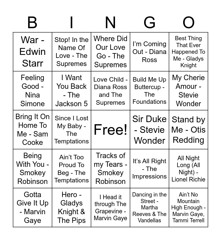 This bingo card has a free space and 51 words: My Girl - The Temptations, Ain’t No Mountain High Enough - Marvin Gaye, Tammi Terrell, Part-Time Lover - Stevie Wonder, I Head it through The Grapevine - Marvin Gaye, Ain’t Too Proud To Beg - The Temptations, Midnight Train to Georgia - Gladys Knight, Stop! In the Name Of Love - The Supremes, Let’s Stay Together - Al Green, Feeling Good - Nina Simone, Something’s Got a Hold On Me - Etta James, I Want You Back - The Jackson 5, I’m Coming Out - Diana Ross, All Night Long (All Night) - Lionel Richie, It’s All Right - The Impressions, It’s Your Thing - The Isley Brothers, Hype Off Your Love - Time to Talk, Love Child - Diana Ross and The Supremes, Sir Duke - Stevie Wonder, Love Train - The Supremes, Best Thing That Ever Happened To Me - Gladys Knight, Since I Lost My Baby - The Temptations, Dancing in the Street - Martha Reeves & The Vandellas, War - Edwin Starr, Build Me Up Buttercup - The Foundations, This Old Heart of Mine - The Isley Brothers, Loving You is Sweeter Than Ever, My Cherie Amour - Stevie Wonder, In The Midnight Hour - Wilson Pickett, Gotta Give It Up - Marvin Gaye, Where Did Our Love Go - The Supremes, Rockin’ Robin - Michael Jackson, Best of My Love - The Emotions, Respect - Aretha Franklin, You Really Got a Hold On Me - Percy Sledge, At Last - Etta James, Hero - Gladys Knight & The Pips, I Can’t Help Myself - Four Tops, Chain of Fools - Aretha Franklin, I Want You Back - The Jackson 5, He Was Really Sayin’ Somethin’ - The Velvettes, Stand by Me - Otis Redding, Being With You - Smokey Robinson, I’ll Be Around - The Spinners, When A Man Loves A Woman - Percy Sledge, Dance to the Music - Sly & The Family Stone, Nightshift - Commodores, Bring It On Home To Me - Sam Cooke, Ooo Baby Baby - Smokey Robinson & The Miracles, I’d Rather Go Blind - Etta James, Tracks of my Tears - Smokey Robinson and Jumpin’ Jack Flash - Thelma Houston.