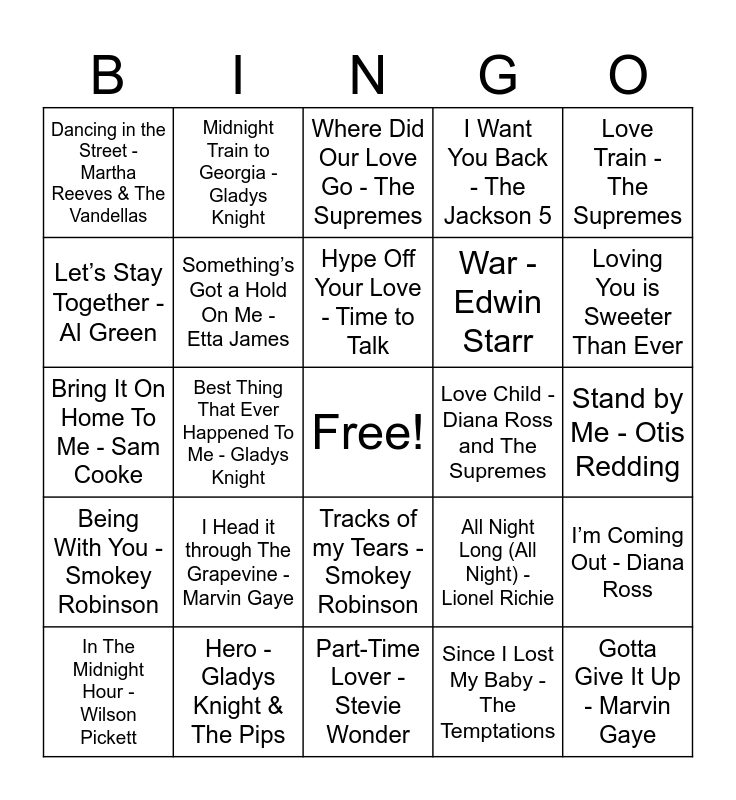 This bingo card has a free space and 51 words: My Girl - The Temptations, Gotta Give It Up - Marvin Gaye, Ain’t No Mountain High Enough - Marvin Gaye, Tammi Terrell, Part-Time Lover - Stevie Wonder, I Head it through The Grapevine - Marvin Gaye, Ain’t Too Proud To Beg - The Temptations, Midnight Train to Georgia - Gladys Knight, Stop! In the Name Of Love - The Supremes, Let’s Stay Together - Al Green, Feeling Good - Nina Simone, Something’s Got a Hold On Me - Etta James, I Want You Back - The Jackson 5, I’m Coming Out - Diana Ross, All Night Long (All Night) - Lionel Richie, It’s All Right - The Impressions, It’s Your Thing - The Isley Brothers, Hype Off Your Love - Time to Talk, Love Child - Diana Ross and The Supremes, Sir Duke - Stevie Wonder, Love Train - The Supremes, Best Thing That Ever Happened To Me - Gladys Knight, Since I Lost My Baby - The Temptations, Dancing in the Street - Martha Reeves & The Vandellas, War - Edwin Starr, Build Me Up Buttercup - The Foundations, This Old Heart of Mine - The Isley Brothers, Loving You is Sweeter Than Ever, My Cherie Amour - Stevie Wonder, In The Midnight Hour - Wilson Pickett, Where Did Our Love Go - The Supremes, Rockin’ Robin - Michael Jackson, Best of My Love - The Emotions, Respect - Aretha Franklin, You Really Got a Hold On Me - Percy Sledge, At Last - Etta James, Hero - Gladys Knight & The Pips, I Can’t Help Myself - Four Tops, Chain of Fools - Aretha Franklin, I Want You Back - The Jackson 5, He Was Really Sayin’ Somethin’ - The Velvettes, Stand by Me - Otis Redding, Being With You - Smokey Robinson, I’ll Be Around - The Spinners, When A Man Loves A Woman - Percy Sledge, Dance to the Music - Sly & The Family Stone, Nightshift - Commodores, Bring It On Home To Me - Sam Cooke, Ooo Baby Baby - Smokey Robinson & The Miracles, I’d Rather Go Blind - Etta James, Tracks of my Tears - Smokey Robinson and Jumpin’ Jack Flash - Thelma Houston.
