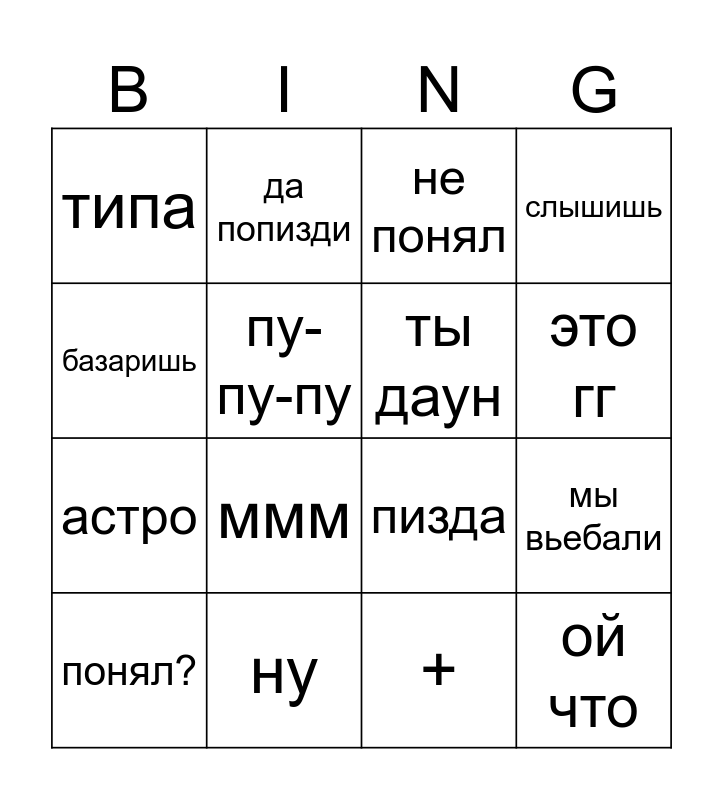 This bingo card has 16 words: ну, мы вьебали, не понял, типа, астро, да попизди, пизда, +, базаришь, пу-пу-пу, понял?, слышишь, ммм, это гг, ты даун and ой что.
