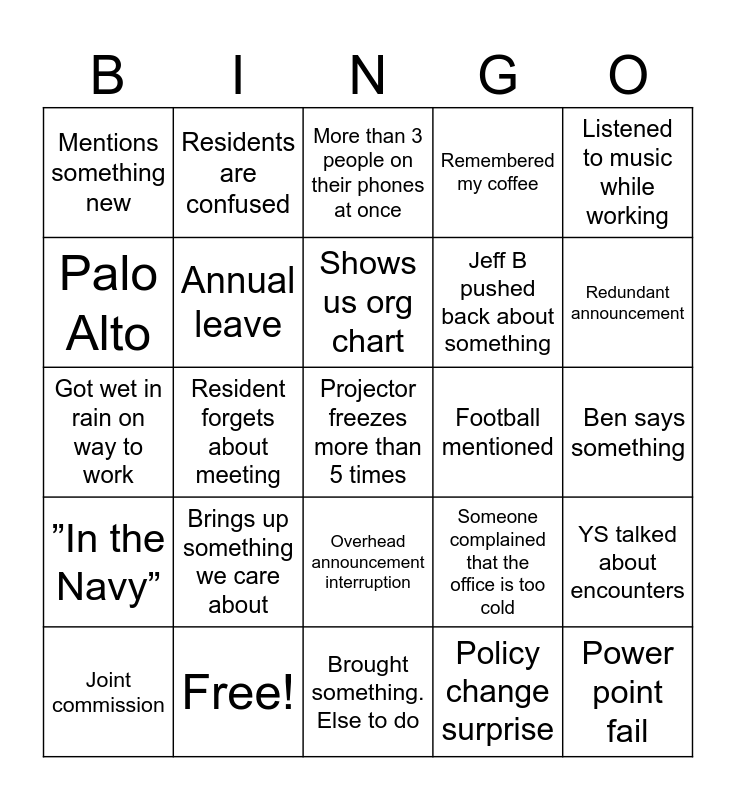 This bingo card has 28 words: YS talked about encounters, Jeff Lee talked at all, Jeff B pushed back about something, Policy change surprise, Palo Alto, More than 3 people on their phones at once, Residents are confused, ”In the Navy”, Football mentioned, Joint commission, Got wet in rain on way to work, Remembered my coffee, Free!, Brought something. Else to do, Redundant announcement, Staff retreat, Brings up something we care about, Annual leave, Shows us org chart, Overhead announcement interruption, Mentions something new, Power point fail, Projector freezes more than 5 times, Resident forgets about meeting, Ben says something, Someone complained that the office is too cold, Listened to music while working and Watched a show/ movie on your phone.