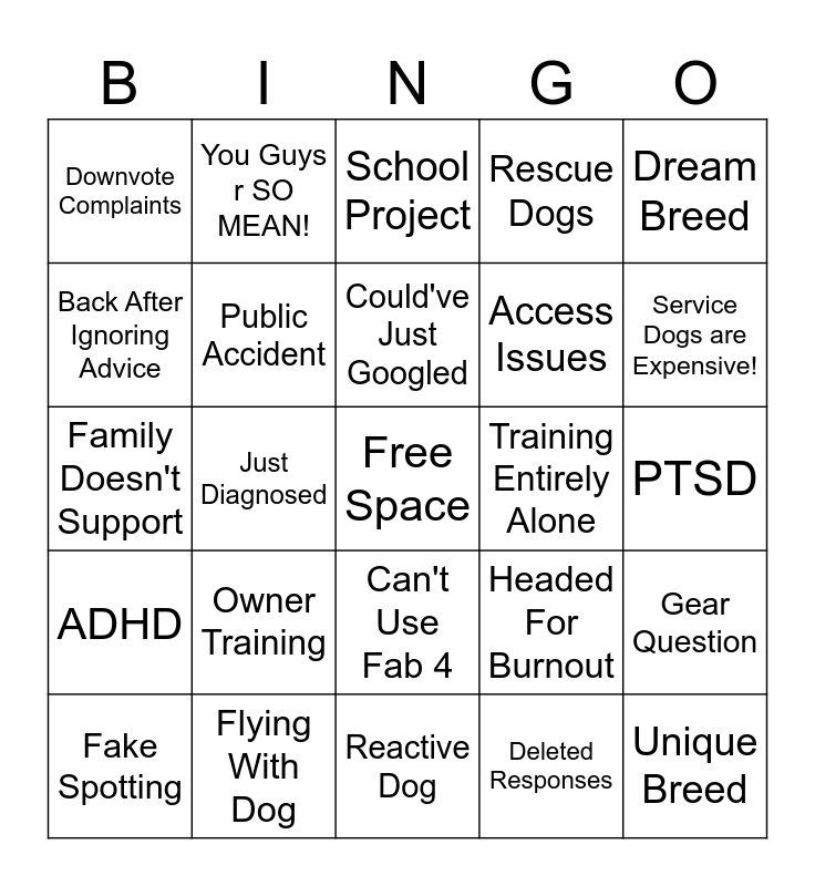 This bingo card has a free space and 52 words: Deleted Post, Unique Breed, Puppy is SDiT, Reactive Dog, Owner Training, Can't afford trainer, You Guys r SO MEAN!, Certification, Back After Ignoring Advice, Teenager, Public Accident, Actually Taking Feedback, Gear Question, Headed For Burnout, Non-US Poster, Legal Question, Could've Just Googled, Training Entirely Alone, Program Dogs, Dream Breed, Just Diagnosed, Deleted Responses, Downvote Complaints, Access Issues, Puppy biting, Housing Issue, Therapy? What Therapy?, Clearly Ignoring Advice, Service Dogs are Expensive!, Gatekeeping, Ableism, Rescue Dogs, Self-Diagnosed Disability, ESA vs Service Dog, Training in College, School Project, Flying With Dog, Dealing With the Public, Service Dog For Child, Dogs are my Special Interest, Autism, PTSD, ADHD, Unethical Mobility Tasks, Can't Use Fab 4, Dogs Can't Do That, Allergies, Family Doesn't Support, Make Pet Into Service Dog, Mod Removal, Fake Spotting and Repeat Poster, Same Issue.