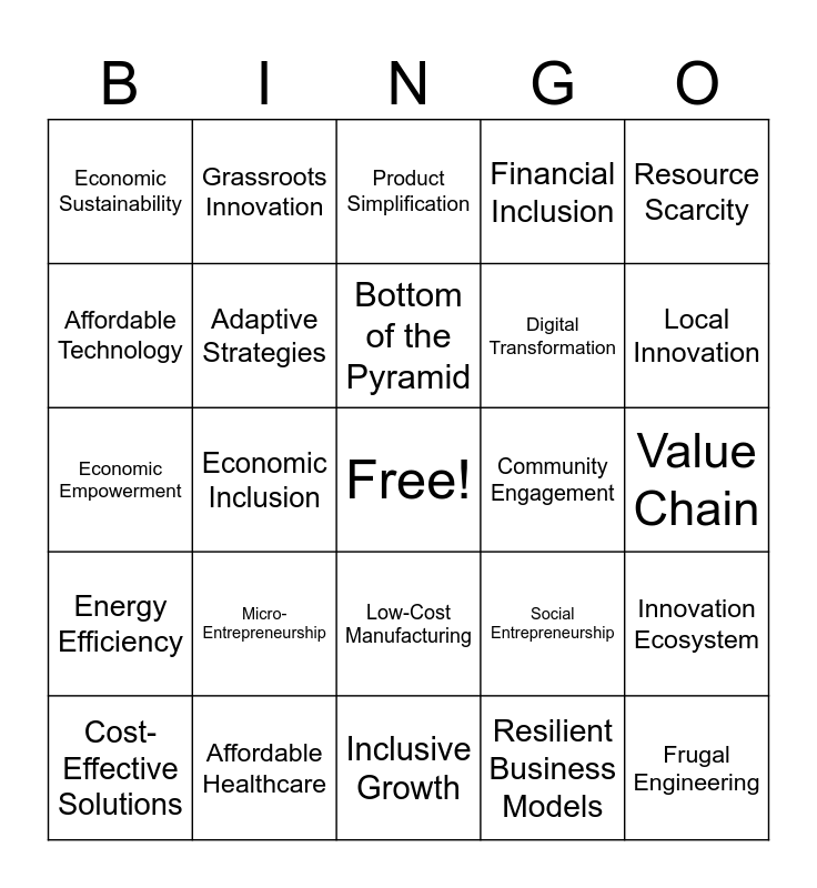 This bingo card has a free space and 25 words: Micro-Entrepreneurship, Inclusive Growth, Bottom of the Pyramid, Cost-Effective Solutions, Resource Scarcity, Economic Sustainability, Affordable Technology, Grassroots Innovation, Community Engagement, Low-Cost Manufacturing, Digital Transformation, Economic Empowerment, Social Entrepreneurship, Innovation Ecosystem, Adaptive Strategies, Market Disruption, Value Chain, Product Simplification, Local Innovation, Economic Inclusion, Frugal Engineering, Affordable Healthcare, Energy Efficiency, Financial Inclusion and Resilient Business Models.