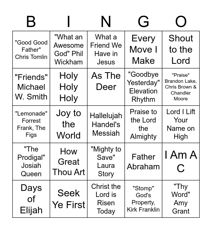 This bingo card has 36 words: "Build Your Kingdom Here" Rend Collective, Thy Strong Word, A Mighty Fortress, Holy Holy Holy, Father Abraham, "The Prodigal" Josiah Queen, As The Deer, "10,000 Reasons" Matt Redman, Shout to the Lord, "Goodness of God" CeCe Winans, Joy to the World, Every Move I Make, The Church's One Foundation, Praise to the Lord the Almighty, "Praise" Brandon Lake, Chris Brown & Chandler Moore, "Good Good Father" Chris Tomlin, "Thy Word" Amy Grant, How Great Thou Art, Hallelujah Handel's Messiah, What a Friend We Have in Jesus, Lord I Lift Your Name on High, I Am A C, Seek Ye First, Days of Elijah, Christ the Lord is Risen Today, "What an Awesome God" Phil Wickham, "Lemonade" Forrest Frank, The Figs, This is the Feast, "Goodbye Yesterday" Elevation Rhythm, "Friends" Michael W. Smith, "Gratitude" Brandon Lake, "Church Clap" (feat. Lecrae), "Stomp" God's Property, Kirk Franklin, "Mighty to Save" Laura Story, "Firm Foundation" (He Won't) Maverick City Music and "Still Waters" (Psalm 23) Leanna Crawford.