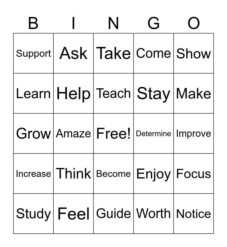 This bingo card has a free space and 29 words: Study, Speak, Amaze, Push, Support, Take, Help, Think, Determine, Feel, Improve, Notice, Guide, Worth, Make, Face, Become, Increase, Show, Grow, Enjoy, Prepare, Stay, Learn, Come, Ask, Focus, Teach and Pay.