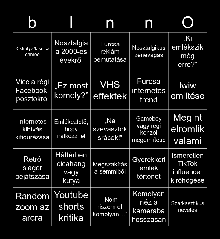 This bingo card has 50 words: Videó elején egy mély sóhaj, „Na szevasztok srácok!”, Kávé vagy energiaital említése, „Nem hiszem el, komolyan…”, Háttérben cicahang vagy kutya, Régi videó bejátszása, Nosztalgia a 2000-es évekről, TikTok kritika, Vicc a régi Facebook-posztokról, Képkockára fagyott reakció, „Ez most komoly?”, Nosztalgikus zenevágás, Ismeretlen TikTok influencer kiröhögése, Gyerekkori emlék történet, Reakció mémre, „Ezt nem hiszem el, ezt látnotok kell”, VHS effektek, Gameboy vagy régi konzol megemlítése, Régi mobiltelefon bemutatása, „Ki emlékszik még erre?”, Emlékeztető, hogy iratkozz fel, Komolyan néz a kamerába hosszasan, Kiskutya/kiscica cameo, Furcsa internetes trend, „Már megint itt tartunk”, Szarkasztikus nevetés, Iwiw említése, Általános iskolás történet, Furcsa reklám bemutatása, Megszakítás a semmiből, Mém hanghatás („bruh”, „vine boom” stb.), „Ez fájt”, Kommentek olvasása, Saját régi komment kinevetése, Youtube shorts kritika, Divat a 2000-es évekből, Erőltetett nosztalgia paródia, „Annak idején…”, Állandó technikai baki (mikrofon, fény stb.), Megint elromlik valami, Paródiás jelenet, Cringe filter, Színes szöveg a képernyőn, „Ezt ne csináljátok otthon!”, Random zoom az arcra, Internetes kihívás kifigurázása, Gimis emlék, „Aki ezt csinálja, az...”, Retró sláger bejátszása and Kazettás magnó említése.