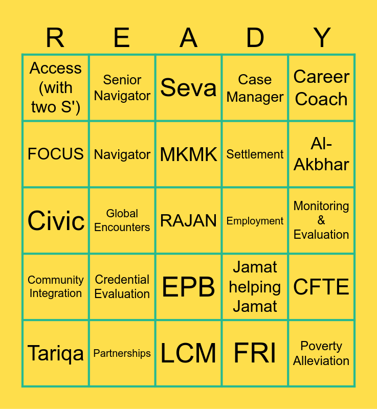 This bingo card has a free space and 74 words: Imamat Assets, Jamat Khana, Seva, DII, GCP, Aga Khan Garden, Aga Khan Park, Umma, Tariqa, Farman, Takht-Nishini, IV, MKMK, FOCUS, Mentor, Global Encounters, Imara, Al-Akbhar, AKYSB, Civic, Navigator, Senior Navigator, Case Manager, Senior Case Manager, Poverty Alleviation, COPE, Social Services, Livelihoods, Vocational Training, Mental Health, Career Coach, NEM, JK Rep, PC&T (People Culture and Training), Communications, FRI, Vulnerability Scout, Crisis Support, Isfand, Service Excellence, LCM, Partnerships, Bow Valley, Durham College, Acces Employment, Access (with two S'), Achev, Credential Evaluation, WES, Intake, Goals, FRO (Future Ready Opportunities), Monitoring & Evaluation, Data Strategy, OJCMS, TNO, EPB, Health Board, Social Welfare Board, CFTE, Settlement, JK Based Model, Community Integration, Language, Employment, FRI is not..., Marathon, Boards & Portfolios, Jamat helping Jamat, SAH, G5, EMPP, Family and Family Mentorship Program.
