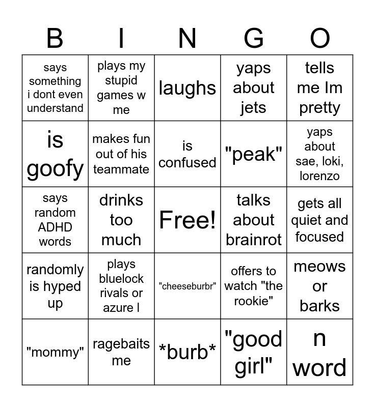 This bingo card has a free space and 24 words: plays bluelock rivals or azure l, ragebaits me, is confused, "mommy", tells me Im pretty, says something i dont even understand, is goofy, plays my stupid games w me, talks about brainrot, "cheeseburbr", "peak", says random ADHD words, offers to watch "the rookie", meows or barks, makes fun out of his teammate, "good girl", gets all quiet and focused, laughs, yaps about sae, loki, lorenzo, drinks too much, n word, randomly is hyped up, yaps about jets and *burb*.