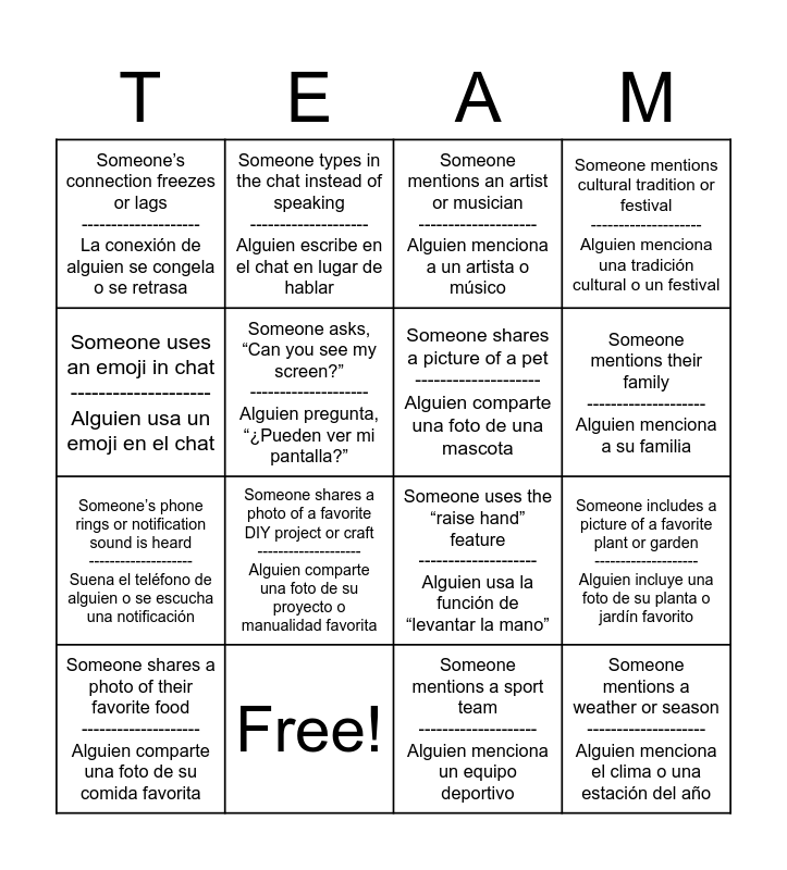 This bingo card has 24 words: Someone says “Sorry, I’m on mute” -------------------- Alguien dice “Perdón, estoy en silencio”, A pet appears on camera -------------------- Una mascota aparece en la cámara, Someone mentions their family -------------------- Alguien menciona a su familia, Someone talks about vacations -------------------- Alguien habla sobre vacaciones, Someone uses an emoji in chat -------------------- Alguien usa un emoji en el chat, Someone’s connection freezes or lags -------------------- La conexión de alguien se congela o se retrasa, Someone asks, “Can you see my screen?” -------------------- Alguien pregunta, “¿Pueden ver mi pantalla?”, Someone types in the chat instead of speaking -------------------- Alguien escribe en el chat en lugar de hablar, Free!, Someone drinks coffee, tea, or water on camera -------------------- Alguien toma café, té o agua frente a la cámara, Someone’s phone rings or notification sound is heard -------------------- Suena el teléfono de alguien o se escucha una notificación, Someone uses the “raise hand” feature -------------------- Alguien usa la función de “levantar la mano”, Someone wears headphones -------------------- Alguien lleva puestos audífonos, Someone shows a travel destination -------------------- Alguien muestra un destino de viaje, Someone shares a picture of a pet -------------------- Alguien comparte una foto de una mascota, Someone talks about a movie, TV show, or book -------------------- Alguien habla sobre una película, serie o libro, Someone mentions a sport team -------------------- Alguien menciona un equipo deportivo, Someone mentions an artist or musician -------------------- Alguien menciona a un artista o músico, Someone shares a photo of a favorite DIY project or craft -------------------- Alguien comparte una foto de su proyecto o manualidad favorita, Someone includes a picture of a favorite plant or garden -------------------- Alguien incluye una foto de su planta o jardín favorito, Someone shares a photo of their favorite food -------------------- Alguien comparte una foto de su comida favorita, Someone mentions a weather or season -------------------- Alguien menciona el clima o una estación del año, Someone mentions cultural tradition or festival -------------------- Alguien menciona una tradición cultural o un festival and Lucky you! Extra “Free!” for you :) -------------------- ¡Qué suerte tienes! un extra “¡Gratis!” para ti :).