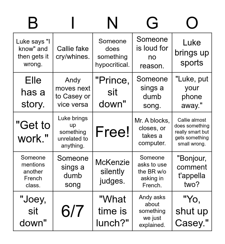 This bingo card has a free space and 24 words: Someone sings a dumb song, 6/7, "Prince, sit down", "Joey, sit down", Luke brings up sports, Luke says "I know" and then gets it wrong., Elle has a story., Callie fake cry/whines., Mr. A blocks, closes, or takes a computer., McKenzie silently judges., Someone sings a dumb song., "Get to work.", Someone asks to use the BR w/o asking in French., "Bonjour, comment t'appella two?, Andy moves next to Casey or vice versa, Andy asks about something we just explained., Callie almost does something really smart but gets something small wrong., Someone does something hypocritical., "Luke, put your phone away.", Luke brings up something unrelated to anything., "Yo, shut up Casey.", Someone mentions another French class., Someone is loud for no reason. and "What time is lunch?".
