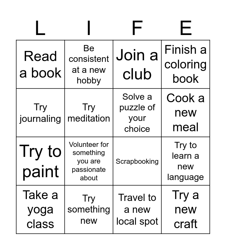 This bingo card has 24 words: Learn how to Garden, Go hiking, Cook a new meal, Try baking, Try journaling, Read a book, Try meditation, Be consistent at a new hobby, Try something new, Find a life purpose, Try to paint, Scrapbooking, Have a game night, Try to crochet or knit something, Solve a puzzle of your choice, Pick up a sport of your choice, Travel to a new local spot, Join a club, Volunteer for something you are passionate about, Try to learn a new language, Take a yoga class, Try a new craft, Finish a coloring book and Finish a cognitive game book (example: word search).