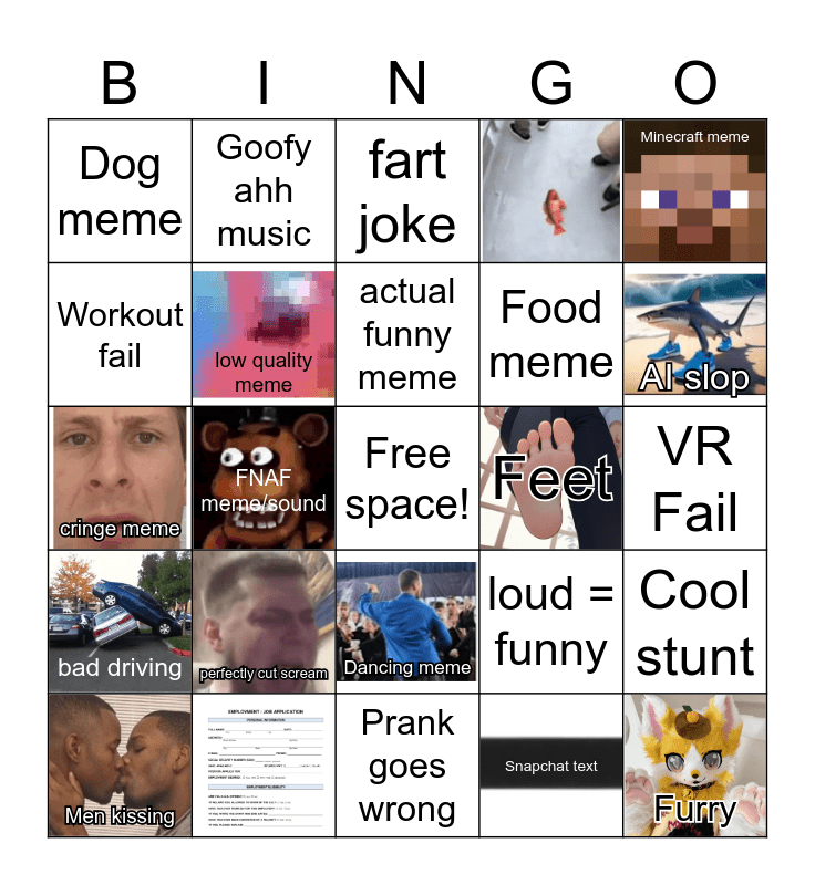 This bingo card has 14 images, a free space and 22 words: perfectly cut scream, actual funny meme, Men kissing, Minecraft meme, Dog meme, Workout fail, Goofy ahh music, Feet, Dancing meme, Food meme, cringe meme, loud = funny, Cool stunt, low quality meme, Snapchat text, VR Fail, fart joke, AI slop, FNAF meme/sound, Furry, bad driving and Prank goes wrong.