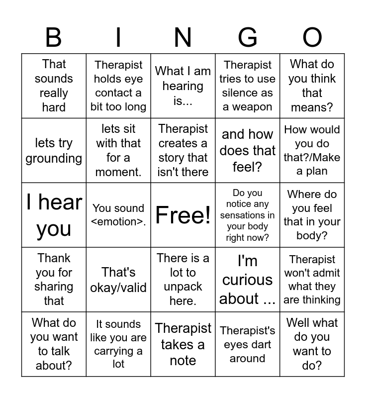 This bingo card has a free space and 29 words: What do you want to talk about?, What did that make you feel?, You sound <emotion>., Wow that is a lot!, That sounds really hard, What I am hearing is..., lets sit with that for a moment., That's okay/valid, Do you notice any sensations in your body right now?, It sounds like you are carrying a lot, Where do you feel that in your body?, Well what do you want to do?, Therapist takes a note, Therapist's eyes dart around, How would you do that?/Make a plan, How was your sleep?, There is a lot to unpack here., Thank you for sharing that, What do you think that means?, I hear you, I'm curious about ..., Can you say more about ..., and how does that feel?, lets try grounding, Therapist tries to use silence as a weapon, Therapist holds eye contact a bit too long, Therapist won't admit what they are thinking, Therapist creates a story that isn't there and Therapist questions what something is for.