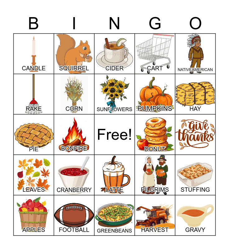 This bingo card has 29 images, a free space and 27 words: APPLES, BONFIRE, BREAD, CANDLE, CIDER, CORN, CRANBERRY, DONUT, FOOTBALL, GRAVY, GREENBEANS, HARVEST, HAY, HORN, LATTE, LEAVES, NATIVEAMERICAN, PIE, PILGRIMS, POTATOES, PUMPKINS, RAKE, CART, SQUIRREL, STUFFING, SUNFLOWERS and TABLE.