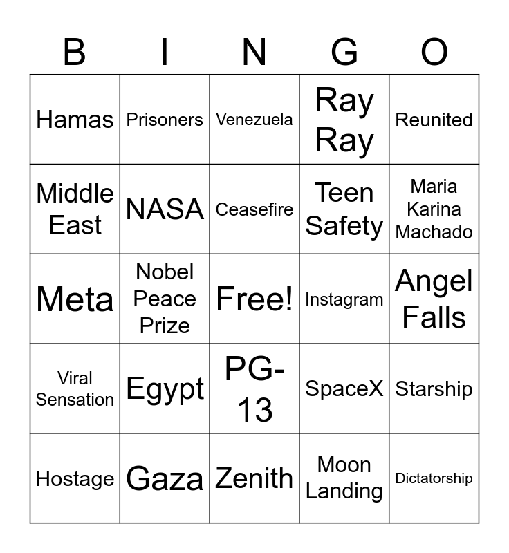 This bingo card has a free space and 24 words: Egypt, Gaza, Ceasefire, Hostage, Reunited, Hamas, Middle East, Prisoners, Instagram, PG-13, Teen Safety, Meta, SpaceX, Starship, NASA, Moon Landing, Angel Falls, Venezuela, Maria Karina Machado, Nobel Peace Prize, Dictatorship, Viral Sensation, Ray Ray and Zenith.
