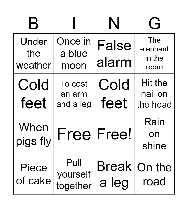 This bingo card has 21 words: Pull yourself together, Break someone´s heart, Once in a blue moon, Piece of cake, Break a leg, Cold feet, Under the weather, False alarm, Free!, Hit the nail on the head, When pigs fly, The elephant in the room, On the road, Know by heart, To cost an arm and a leg, Break the ice, Piece of cake, Free, Cold feet, Rain on shine and When pigs fly.