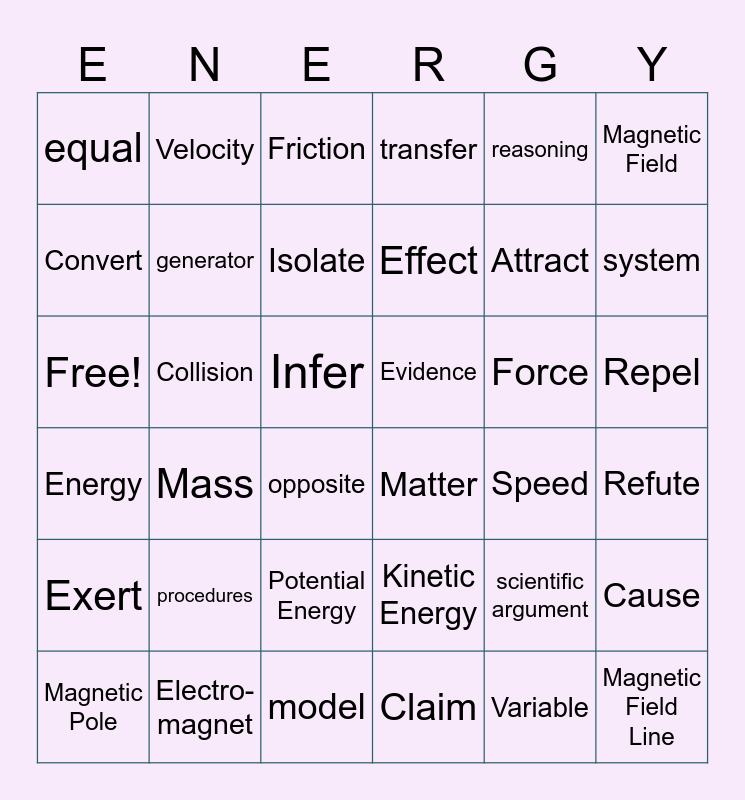 This bingo card has 36 words: Kinetic Energy, Potential Energy, Claim, Convert, Energy, Evidence, generator, model, reasoning, scientific argument, system, transfer, Cause, Collision, Effect, equal, Exert, Force, Free!, Friction, Infer, Mass, Matter, opposite, Speed, Velocity, Attract, Electro- magnet, Isolate, Magnetic Field, Magnetic Field Line, Magnetic Pole, Refute, Repel, procedures and Variable.