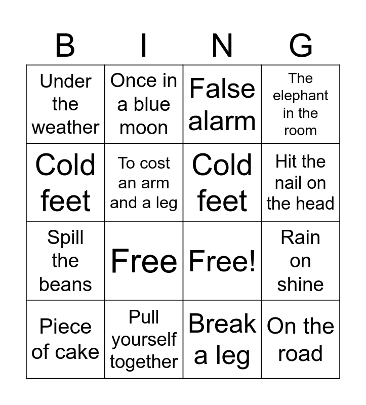 This bingo card has 21 words: Pull yourself together, Break someone´s heart, Once in a blue moon, Better late than never, Break a leg, Cold feet, Under the weather, False alarm, Free!, Hit the nail on the head, Spill the beans, The elephant in the room, On the road, Know by heart, To cost an arm and a leg, Break the ice, Piece of cake, Free, Cold feet, Rain on shine and When pigs fly.