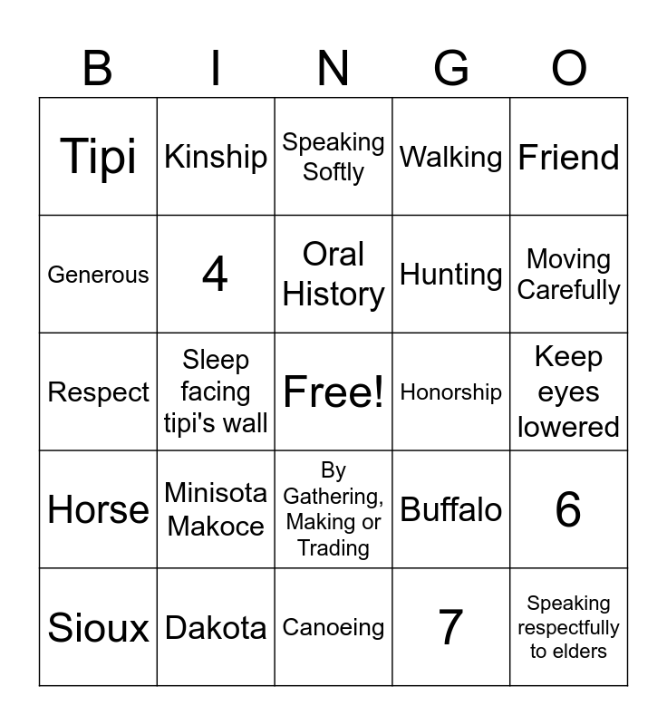 This bingo card has a free space and 24 words: Minisota Makoce, Dakota, Oral History, Sioux, Friend, Tipi, Generous, Kinship, Honorship, By Gathering, Making or Trading, Hunting, Respect, Buffalo, 6, 4, 7, Keep eyes lowered, Speaking Softly, Moving Carefully, Sleep facing tipi's wall, Speaking respectfully to elders, Horse, Walking and Canoeing.
