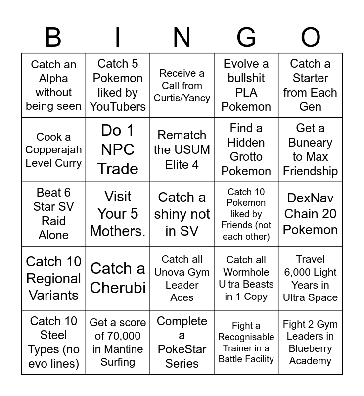This bingo card has a free space and 24 words: Catch a Cherubi, Get a score of 70,000 in Mantine Surfing, Rematch the USUM Elite 4, Catch 10 Steel Types (no evo lines), Catch a Starter from Each Gen, Catch an Alpha without being seen, Cook a Copperajah Level Curry, Catch 5 Pokemon liked by YouTubers, Catch 10 Pokemon liked by Friends (not each other), Catch all Unova Gym Leader Aces, Find a Hidden Grotto Pokemon, Beat 6 Star SV Raid Alone, Catch all Wormhole Ultra Beasts in 1 Copy, Travel 6,000 Light Years in Ultra Space, Do 1 NPC Trade, Fight a Recognisable Trainer in a Battle Facility, DexNav Chain 20 Pokemon, Receive a Call from Curtis/Yancy, Get a Buneary to Max Friendship, Visit Your 5 Mothers., Fight 2 Gym Leaders in Blueberry Academy, Catch 10 Regional Variants, Evolve a bullshit PLA Pokemon and Complete a PokeStar Series.