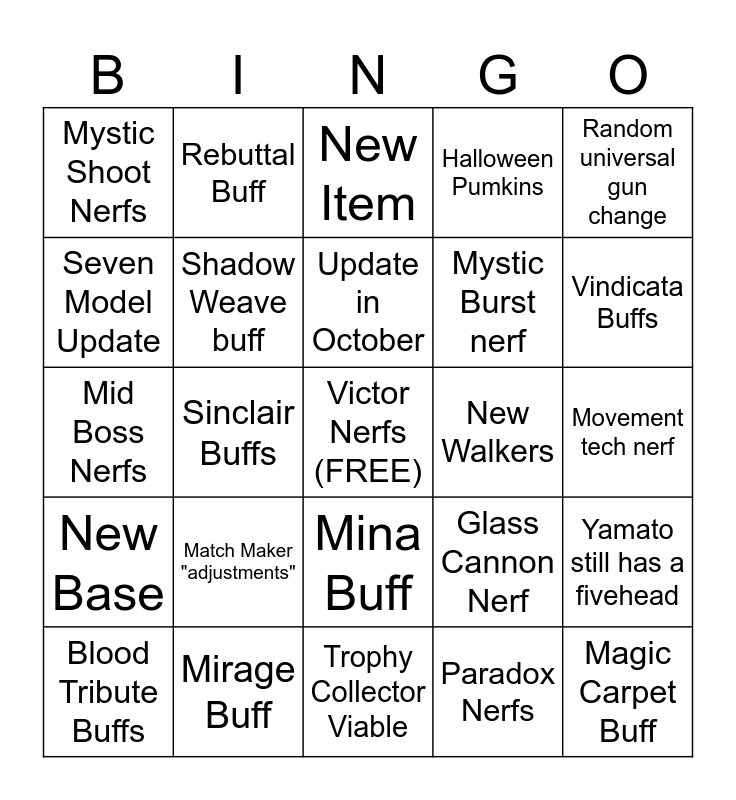 This bingo card has a free space and 24 words: Match Maker "adjustments", Mirage Buff, Update in October, Blood Tribute Buffs, Random universal gun change, Mystic Shoot Nerfs, Seven Model Update, Rebuttal Buff, New Walkers, Mina Buff, Mystic Burst nerf, Mid Boss Nerfs, Glass Cannon Nerf, Yamato still has a fivehead, Shadow Weave buff, Paradox Nerfs, Movement tech nerf, New Item, Vindicata Buffs, Sinclair Buffs, Magic Carpet Buff, New Base, Halloween Pumkins and Trophy Collector Viable.