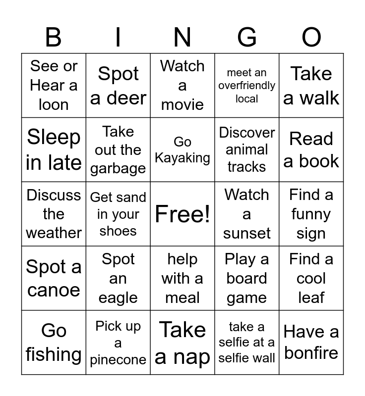 This bingo card has a free space and 25 words: Spot an eagle, Take a nap, Go Kayaking, Go fishing, Take a walk, See or Hear a loon, Sleep in late, Spot a deer, Watch a sunset, help with a meal, Discover animal tracks, Discuss the weather, Play a board game, Find a cool leaf, Take out the garbage, Spot a hammock, Find a funny sign, Watch a movie, Read a book, Get sand in your shoes, Have a bonfire, Pick up a pinecone, Spot a canoe, meet an overfriendly local and take a selfie at a selfie wall.