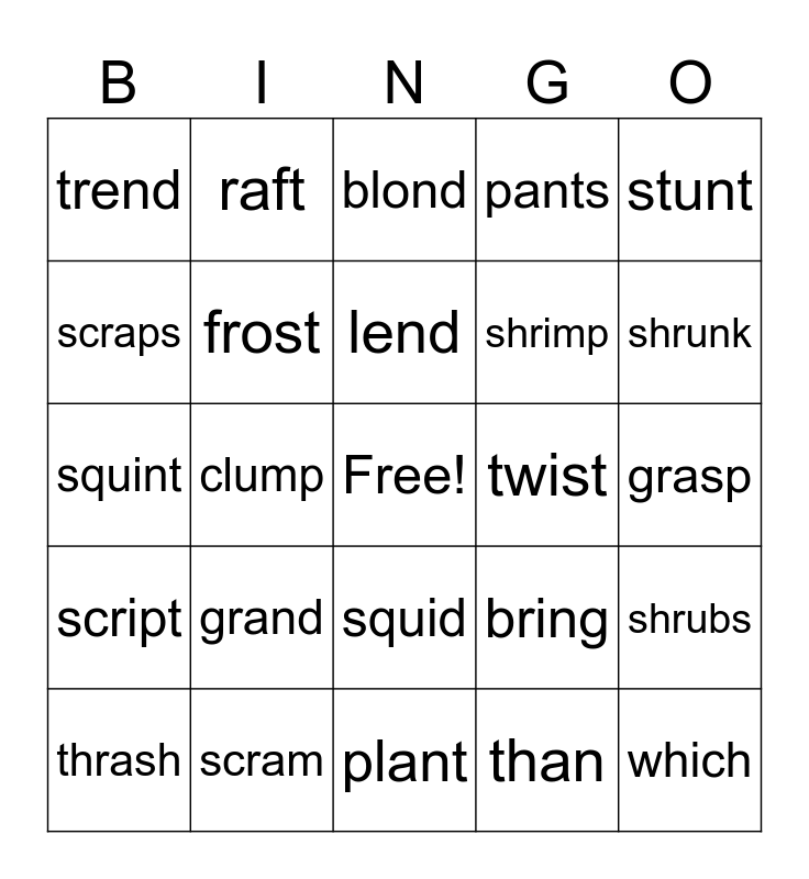 This bingo card has a free space and 30 words: scram, bland, clump, glint, trend, blond, frost, squid, twist, plant, grasp, which, than, thumb, shrunk, long, bring, script, grand, stunt, squint, slept, raft, shrimp, scraps, pants, shrubs, thrash, lend and trip.