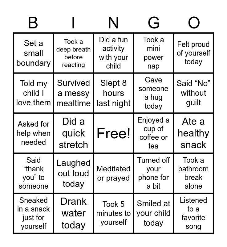 This bingo card has a free space and 24 words: Laughed out loud today, Drank water today, Slept 8 hours last night, Sneaked in a snack just for yourself, Felt proud of yourself today, Set a small boundary, Told my child I love them, Took a deep breath before reacting, Enjoyed a cup of coffee or tea, Meditated or prayed, Gave someone a hug today, Asked for help when needed, Turned off your phone for a bit, Took a bathroom break alone, Survived a messy mealtime, Smiled at your child today, Ate a healthy snack, Did a fun activity with your child, Said “No” without guilt, Did a quick stretch, Listened to a favorite song, Said “thank you” to someone, Took a mini power nap and Took 5 minutes to yourself.