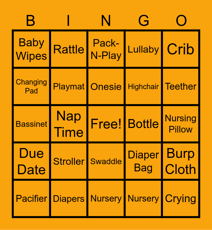 This bingo card has a free space and 24 words: Stroller, Diapers, Onesie, Pacifier, Crib, Baby Wipes, Changing Pad, Rattle, Bottle, Swaddle, Highchair, Bassinet, Diaper Bag, Burp Cloth, Playmat, Nursery, Nursing Pillow, Pack-N-Play, Teether, Nap Time, Crying, Due Date, Lullaby and Nursery.