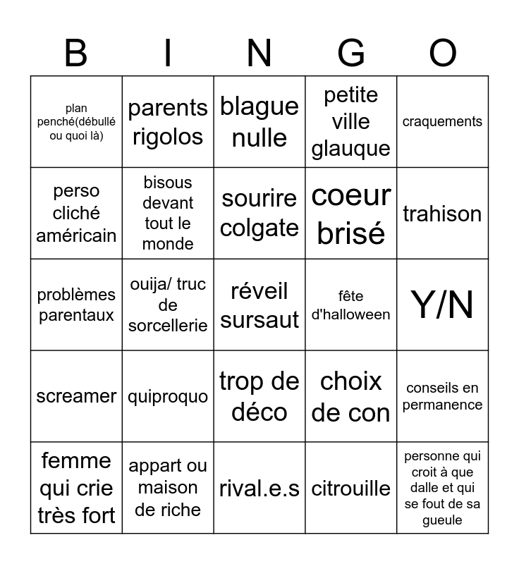 This bingo card has a free space and 24 words: quiproquo, appart ou maison de riche, sourire colgate, femme qui crie très fort, craquements, plan penché(débullé ou quoi là), perso cliché américain, parents rigolos, fête d'halloween, trop de déco, coeur brisé, problèmes parentaux, choix de con, conseils en permanence, bisous devant tout le monde, citrouille, Y/N, blague nulle, trahison, ouija/ truc de sorcellerie, personne qui croit à que dalle et qui se fout de sa gueule, screamer, petite ville glauque and rival.e.s.