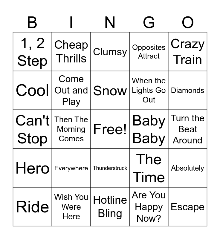 This bingo card has a free space and 40 words: Youth of the Nation, Can't Stop, Pretty Fly, Come Out and Play, Wish You Were Here, Thunderstruck, Snow, Click Click Boom, Crazy Train, Hero, Then The Morning Comes, Opposites Attract, Escape, Turn the Beat Around, Baby Baby, Everywhere, Here We Go, 1, 2 Step, Don't Turn Around, Clumsy, Absolutely, Are You Happy Now?, When the Lights Go Out, Cool, OUT OUT, Memories, Cold Heart, Sunroof, Flowers, Stereo Hearts, Ordinary, Ride, Royals, The Time, Diamonds, Hotline Bling, Chandelier, Thunder, Cheap Thrills and Kiss from a Rose.