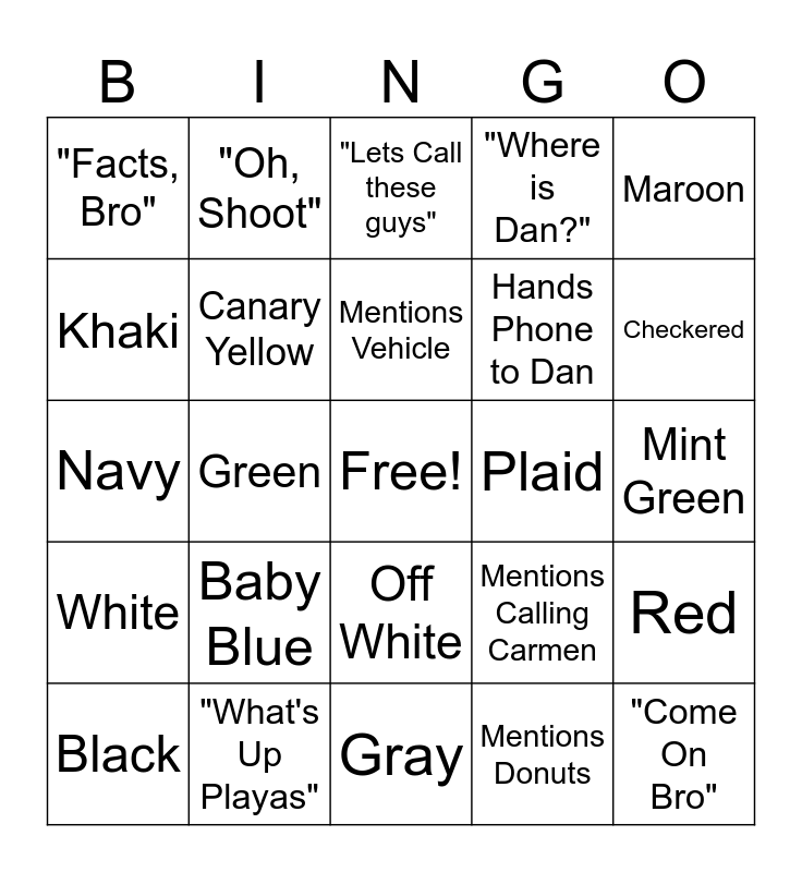 This bingo card has a free space and 24 words: Baby Blue, "What's Up Playas", Mentions Vehicle, Black, Maroon, "Facts, Bro", Khaki, "Oh, Shoot", Plaid, Off White, Hands Phone to Dan, Navy, Mentions Calling Carmen, Red, Canary Yellow, Mentions Donuts, Mint Green, "Lets Call these guys", Checkered, Green, "Come On Bro", White, "Where is Dan?" and Gray.