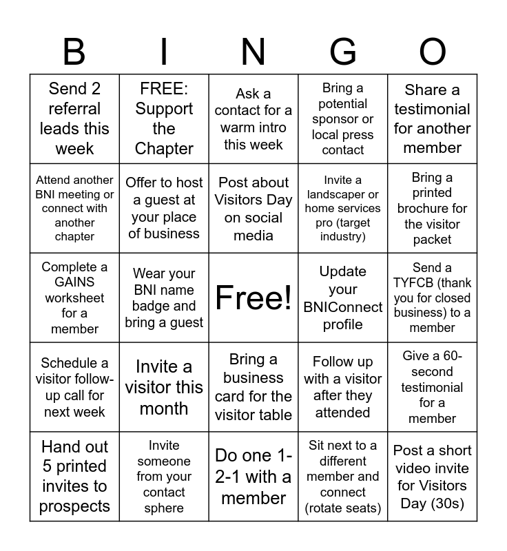 This bingo card has a free space and 25 words: Invite a visitor this month, Do one 1-2-1 with a member, Post about Visitors Day on social media, Hand out 5 printed invites to prospects, Share a testimonial for another member, Send 2 referral leads this week, Attend another BNI meeting or connect with another chapter, FREE: Support the Chapter, Update your BNIConnect profile, Bring a business card for the visitor table, Invite a landscaper or home services pro (target industry), Complete a GAINS worksheet for a member, Follow up with a visitor after they attended, Give a 60-second testimonial for a member, Offer to host a guest at your place of business, Refer a service you used in last 30 days, Send a TYFCB (thank you for closed business) to a member, Ask a contact for a warm intro this week, Bring a printed brochure for the visitor packet, Wear your BNI name badge and bring a guest, Post a short video invite for Visitors Day (30s), Invite someone from your contact sphere, Schedule a visitor follow-up call for next week, Bring a potential sponsor or local press contact and Sit next to a different member and connect (rotate seats).